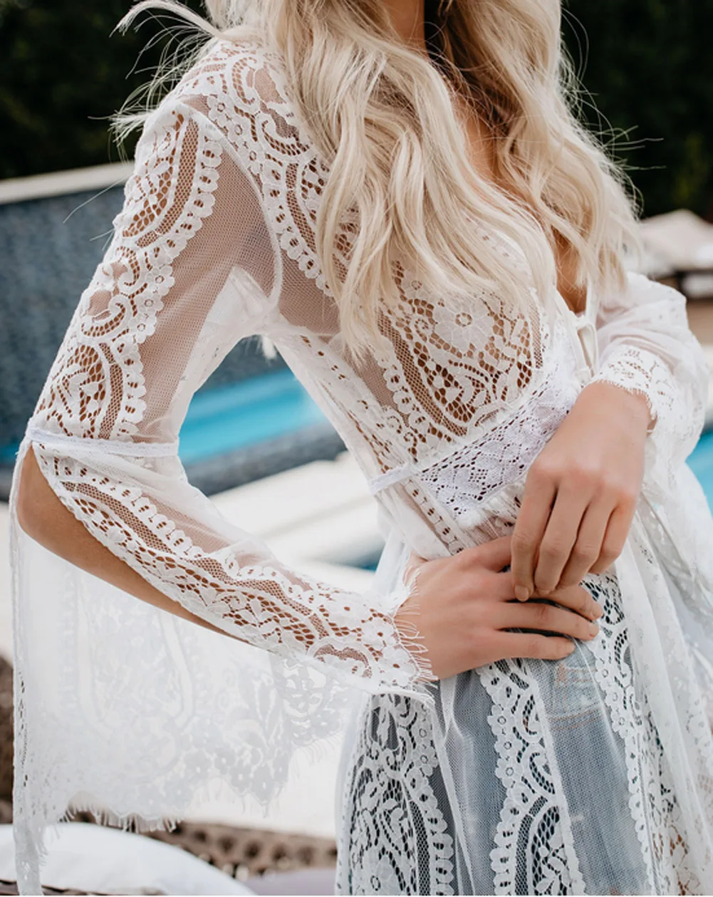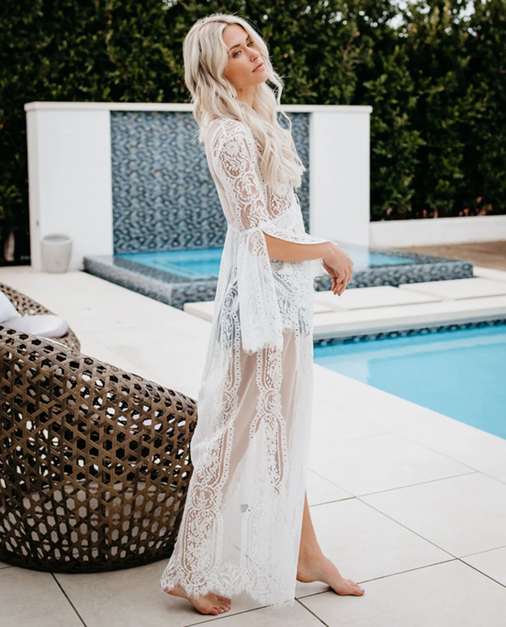 Hot Summer Bikini Cover-Up – Long Sleeve Lace Crochet Kaftan Sarong Dress
