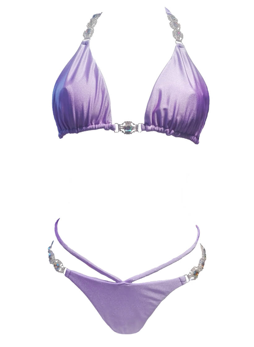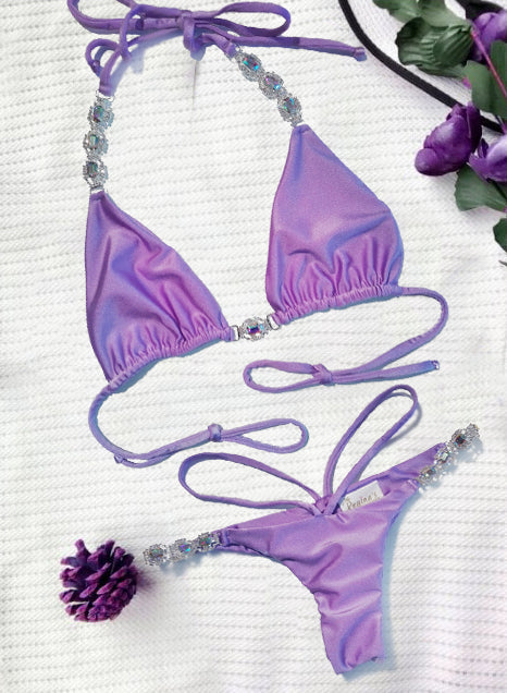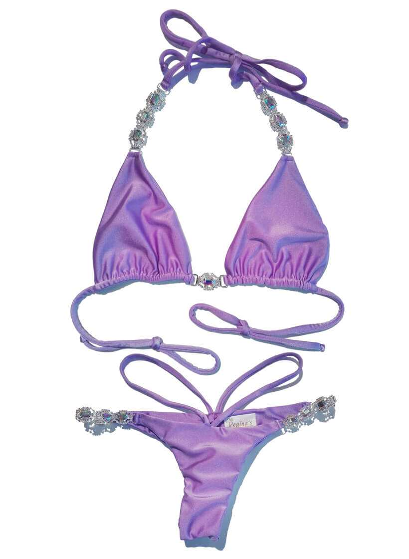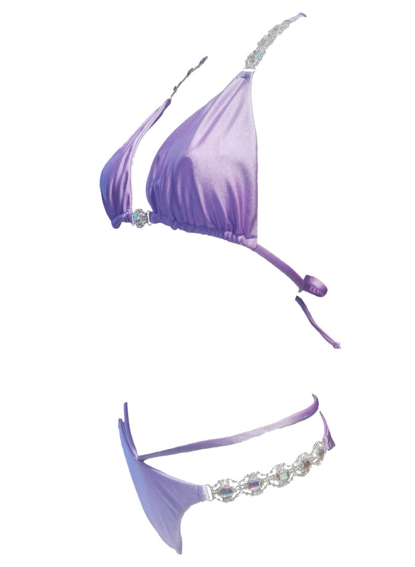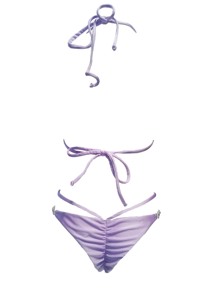 Show off your beachside neon purple bikini style in this designer bikini set featuring triangle cups with 2 jewelry, halter straps and a sophisticated hardware with strappy sides and a sexy tango bottom.