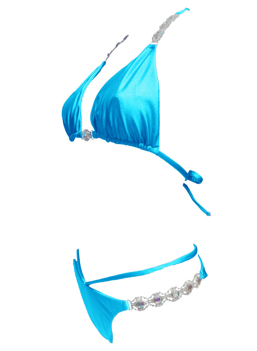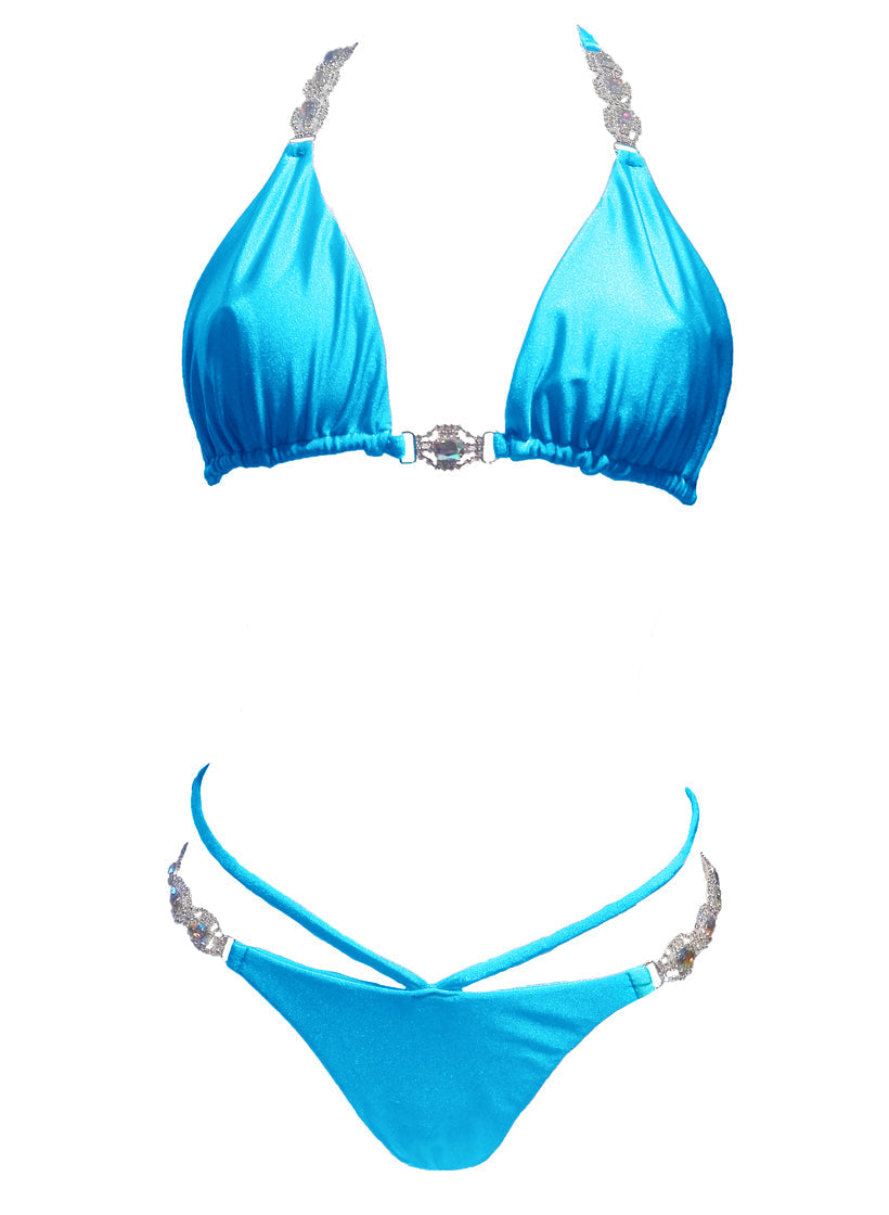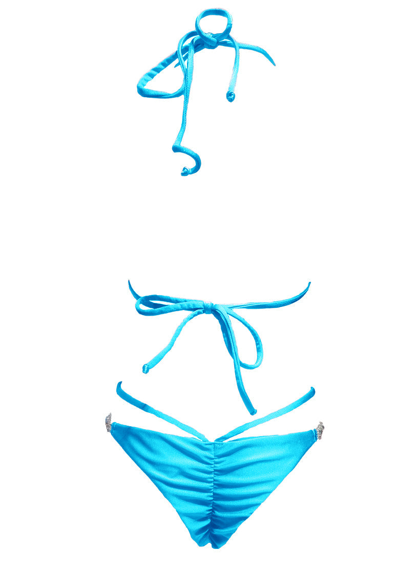Show off your beachside neon turquoise bikini style in this designer bikini set featuring triangle cups with 2 jewelry, halter straps and a sophisticated hardware with strappy sides and a sexy tango bottom.
