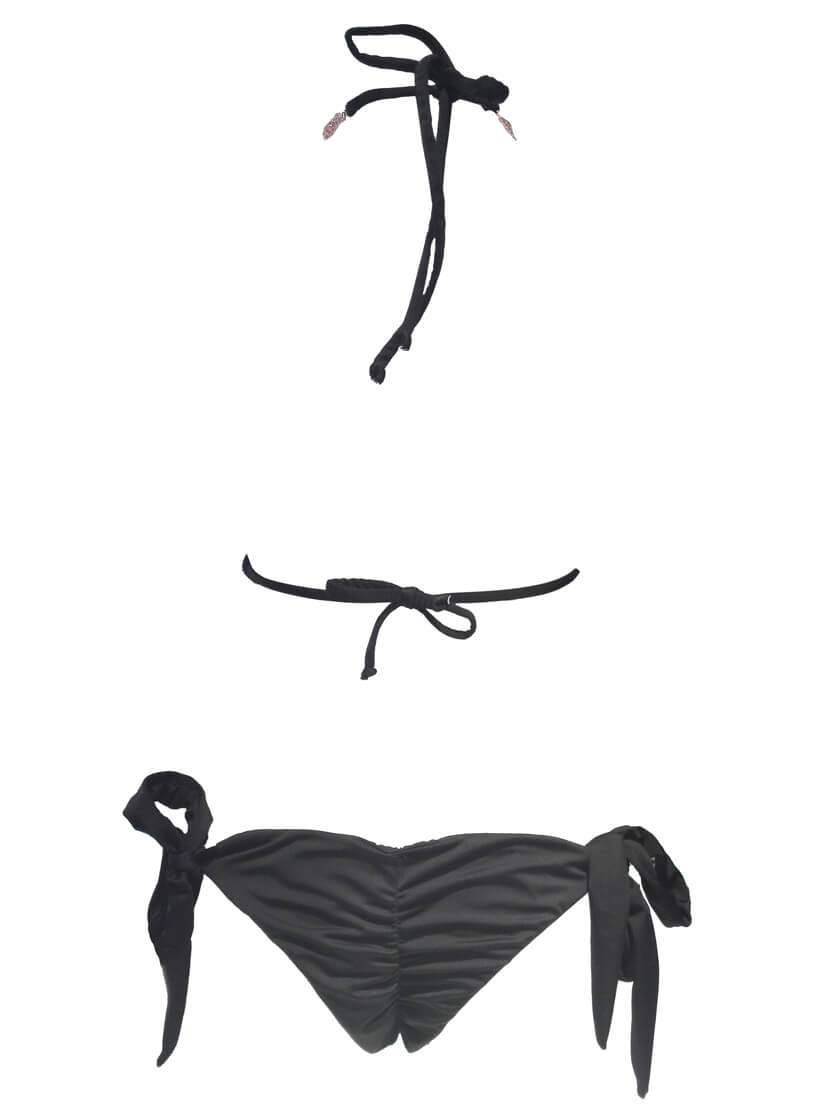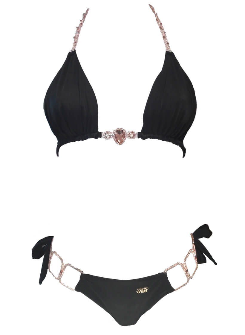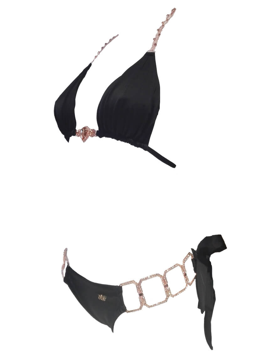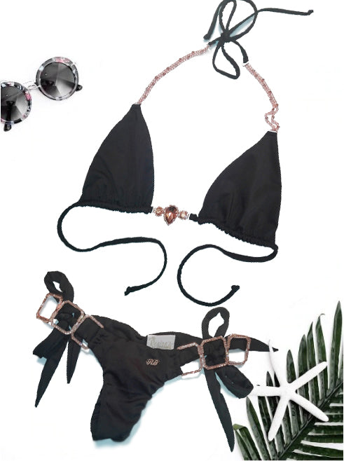 This amazing black bikini set features a triangle top with luxury thin rose gold chain, halter straps, a tie back closure, and skimpy bottoms with large square hardware accents, side tie closures.