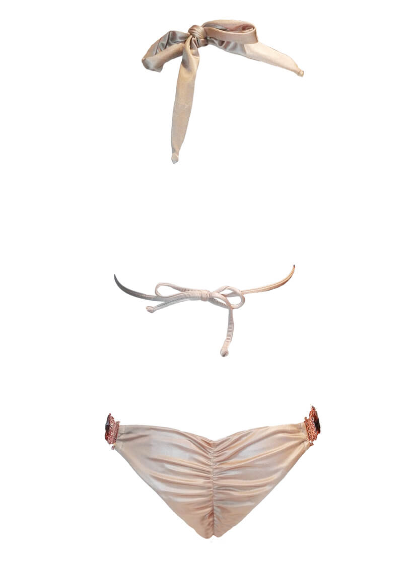 One of our most requested shiny gold bikini styles. Halter top and skimpy bottom with full shirring. Both top and bottom have extravagant rhinestone embellished hardware. Check out the product shot to see all the details.