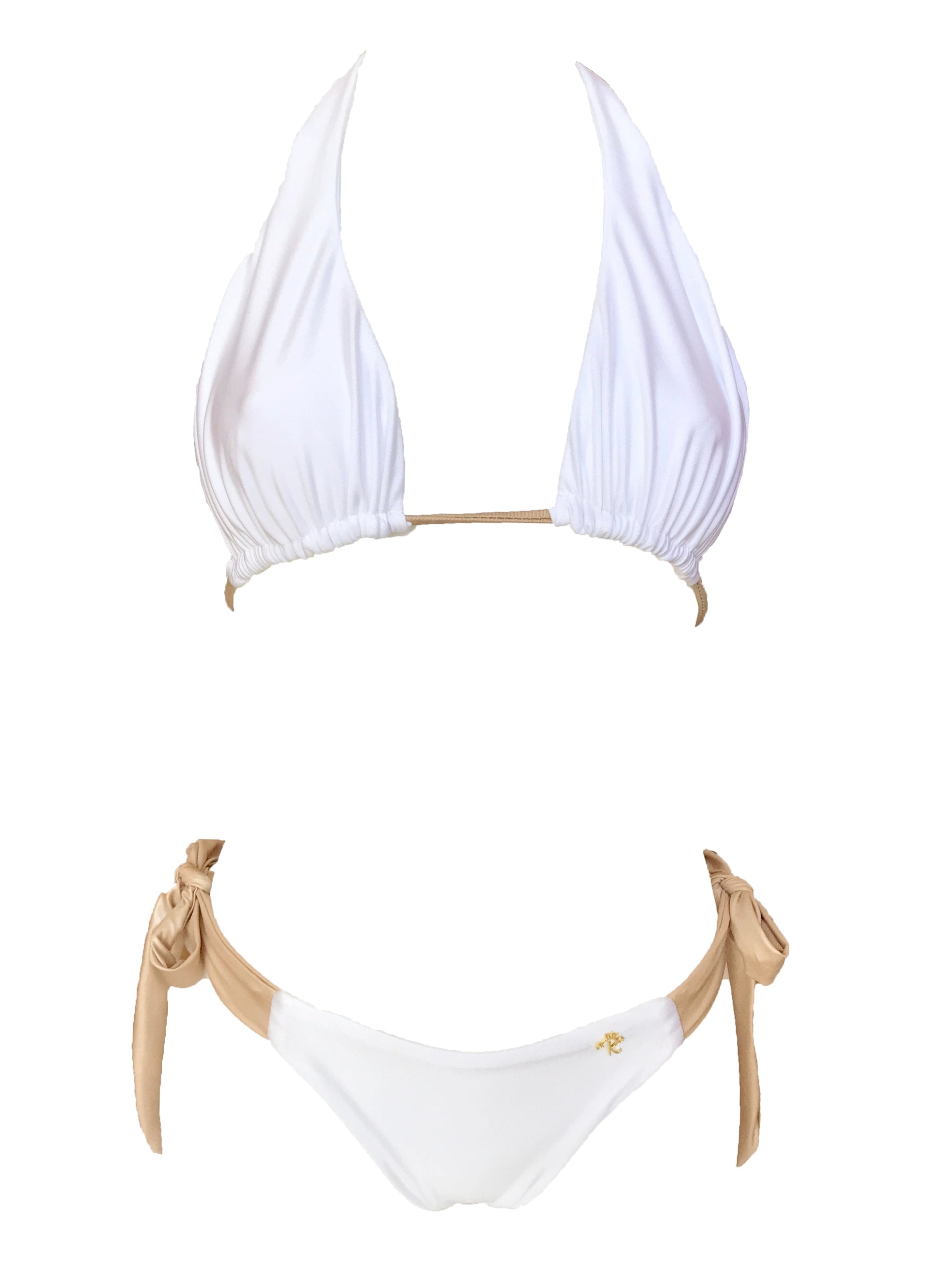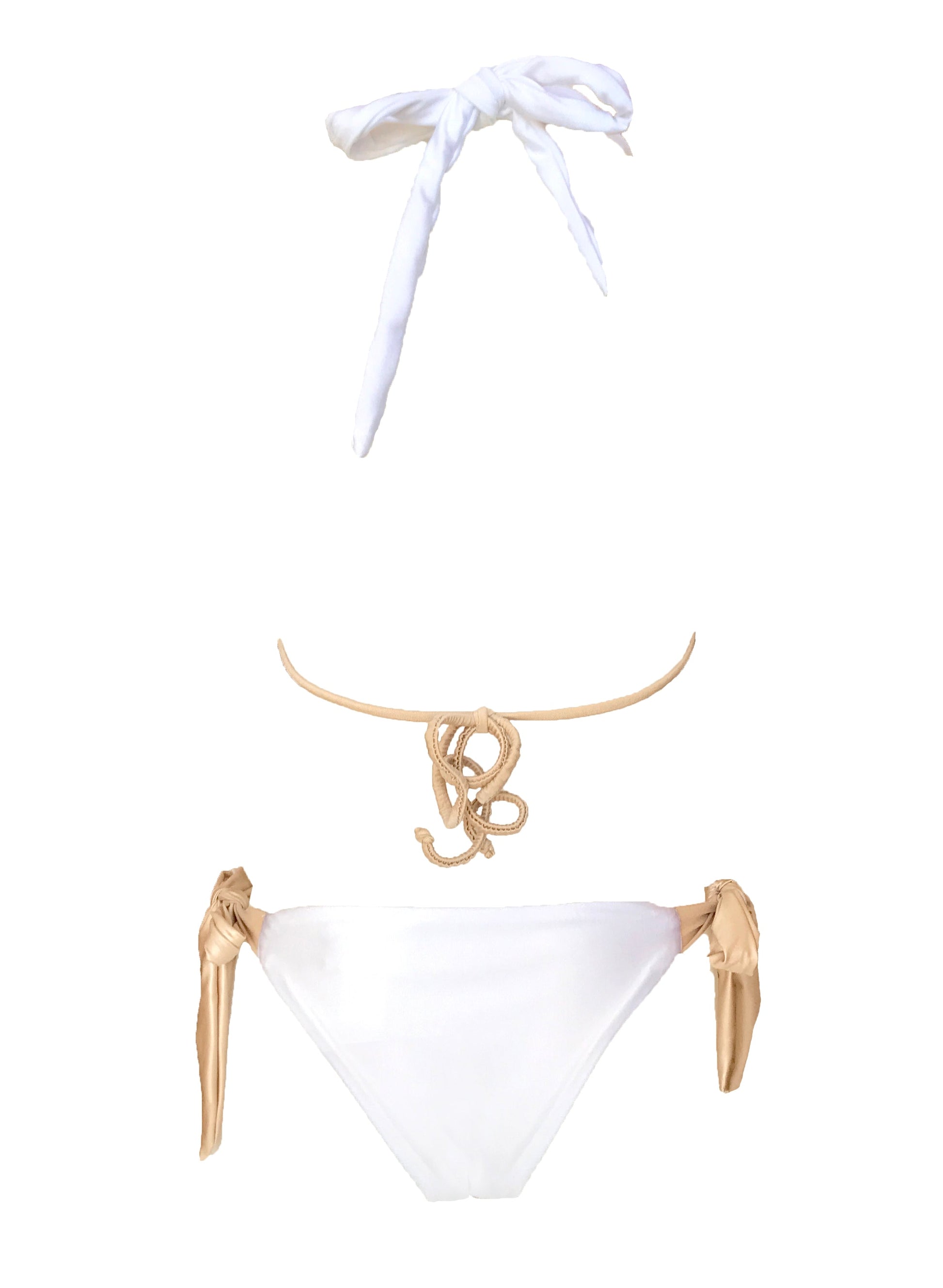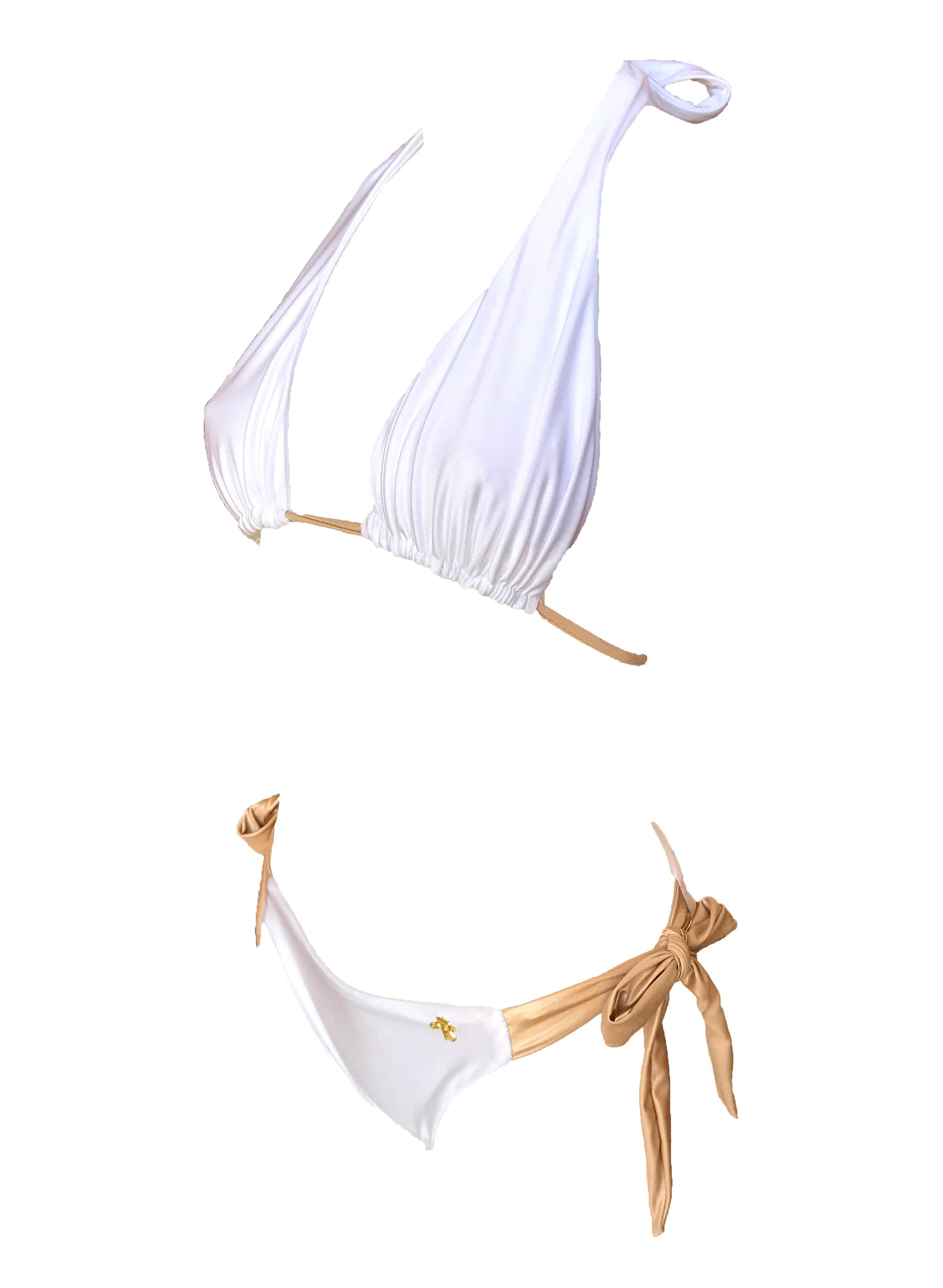 Our Trish Top is a very simple bikini top that is sure to be perfect for anyone thanks to it's great coverage. It's specialty lies in the pairing of the white-and-gold colors. In a perfect combination, the white-gold combo also appears at the bottom. Thanks to the wide binders of the site, it can be a great choice for anyone to adapt it perfectly to their own shape.